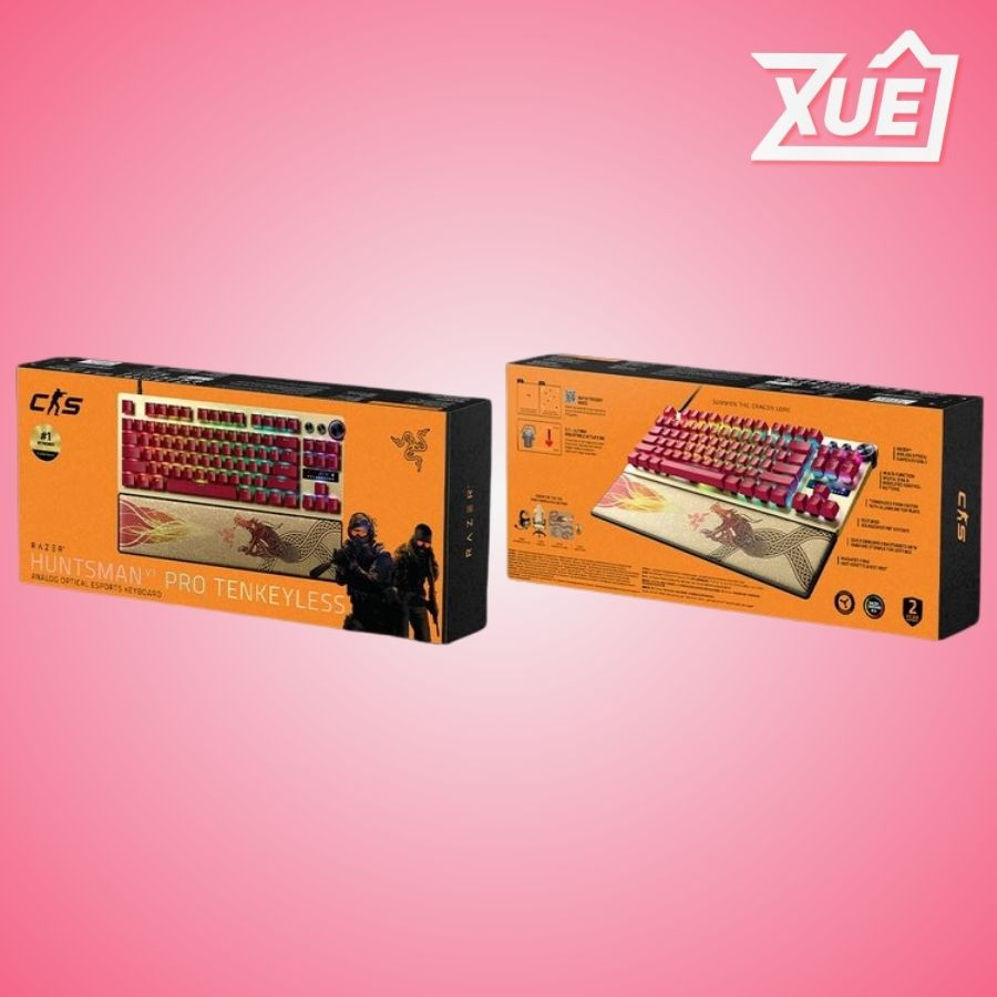 Bàn phím cơ Razer Huntsman V3 Pro TKL CS2 Counter-Strike 2 Edition Analog Optical switch Phiên bản đặc biệt với Skin CS2 Dragon Lore đẳng cấp nhất Sử dụng switch quang Razer Optical Gen 2 có thể điều chỉnh active poit từ 1 -> 4mm, cao cấp nhất trên thế giới Tùy chỉnh được active point Hỗ trợ Rapid Trigger Lực bấm chỉ 40gram, tốc độ cực nhanh Tích hợp các nút vặn điều chỉnh nhanh chóng Keycap PBT Double Shot xuyên led siêu bền Mặt trên phím bằng nhôm cao cấp bền bỉ Kê tay da nam châm chất lượng cao