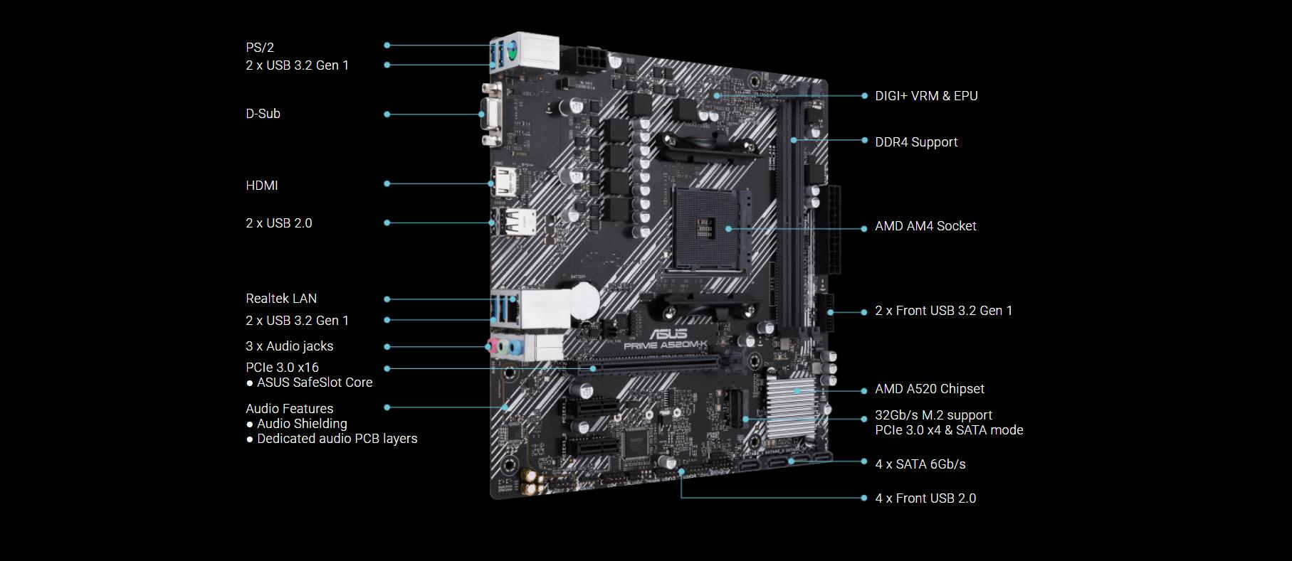 Mainboard ASUS PRIME A520M-K là bo mạch chủ chuẩn mATX sử dụng chipset A520, thiết kế dành cho các hệ thống AMD Ryzen sử dụng socket AM4. Nếu bạn muốn xây dựng một máy tính Ryzen với chi phí hợp lý, tận dụng RAM DDR4 hiện có mà vẫn có khả năng mở rộng SSD M.2 tốc cao — A520M-K là lựa chọn cân bằng giữa độ ổn định và tính năng cơ bản.