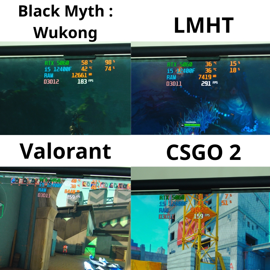 Trong các bài test thực tế, cấu hình i5-12400F kết hợp RTX 5060 cho hiệu năng rất ấn tượng. Black Myth: Wukong đạt khoảng 180 FPS với GPU load cao nhưng nhiệt độ chỉ quanh mức 58°C, chơi mượt và ổn định lâu dài. LMHT đạt trên 290 FPS, Valorant duy trì khoảng 250 FPS, rất phù hợp cho màn hình 144Hz đến 165Hz, trong khi CS2 đạt khoảng 160 FPS với độ ổn định cao, phản hồi nhanh khi thi đấu.