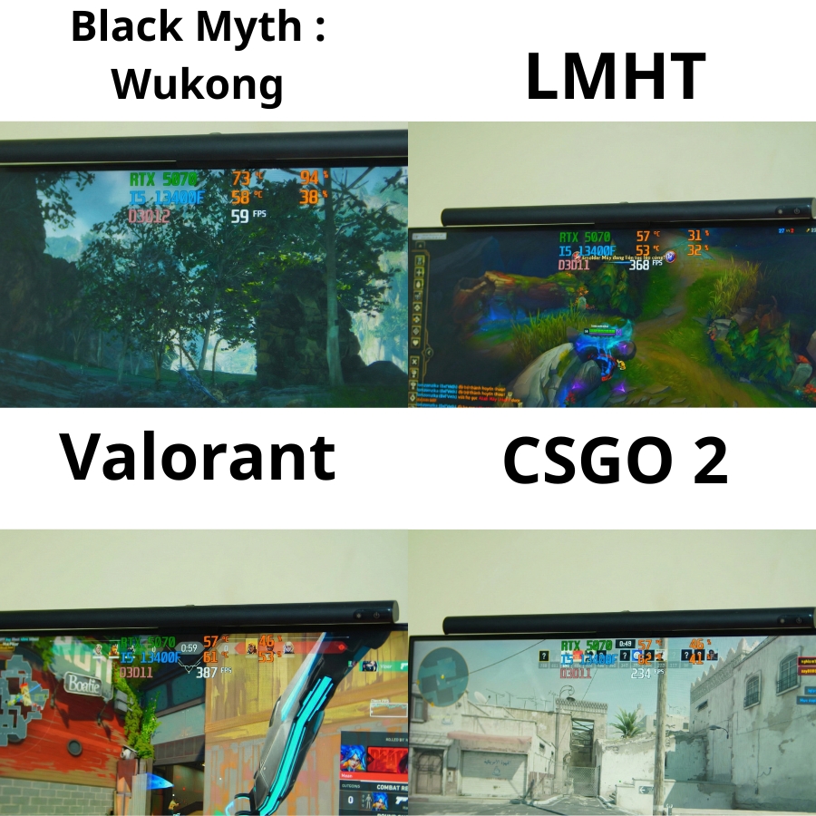 Với Black Myth: Wukong, hệ thống đạt khoảng 59 FPS, GPU load cao nhưng nhiệt độ ổn định, chơi mượt ở thiết lập cao – rất tốt với một tựa game AAA nặng.