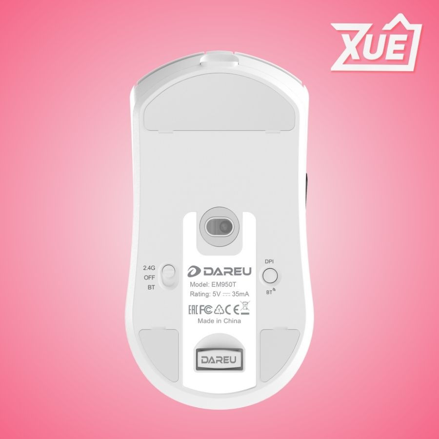 Chuột DareU EM950T Wireless White Chế độ kết nối: 2.4G + Bluetooth + có dây Nút bấm: 50 triệu lần nhấn (L/R) Chất liệu nút: PBT Kích thước/Trọng lượng: 123×64×39 mm / 63 ± 3 g Cáp: 1.5 m Pin: 500 mAh (sạc ~2 giờ) Hệ điều hành hỗ trợ: Windows 7/8/10/11, Android, macOS Cảm biến: AIM-WL Tốc độ tracking: 300 IPS Tăng tốc: 35G DPI: 400 / 800 / 1200 / 1600 (mặc định) / 2000 / tối đa 12.000 Polling rate: Có dây và wireless 2,4Ghz: 1000 Hz, Bluetooth: 125 Hz Thời gian sử dụng: ~62 giờ không dây