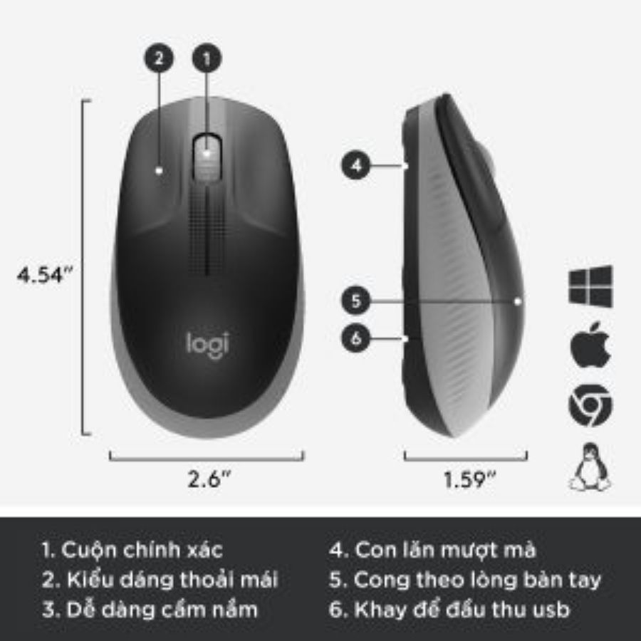 Sản phẩm kết nối qua dongle USB 2.4 GHz (Plug & Play) — chỉ cần cắm là dùng, không cần cài đặt driver. Chuột sở hữu thiết kế đối xứng, phù hợp với cả người thuận tay trái và phải. M190 được trang bị công tắc bền, cuộn không gây ồn, và độ nhạy ổn định — đáp ứng tốt các tác vụ từ lướt web, soạn thảo đến những phần mềm văn phòng.
