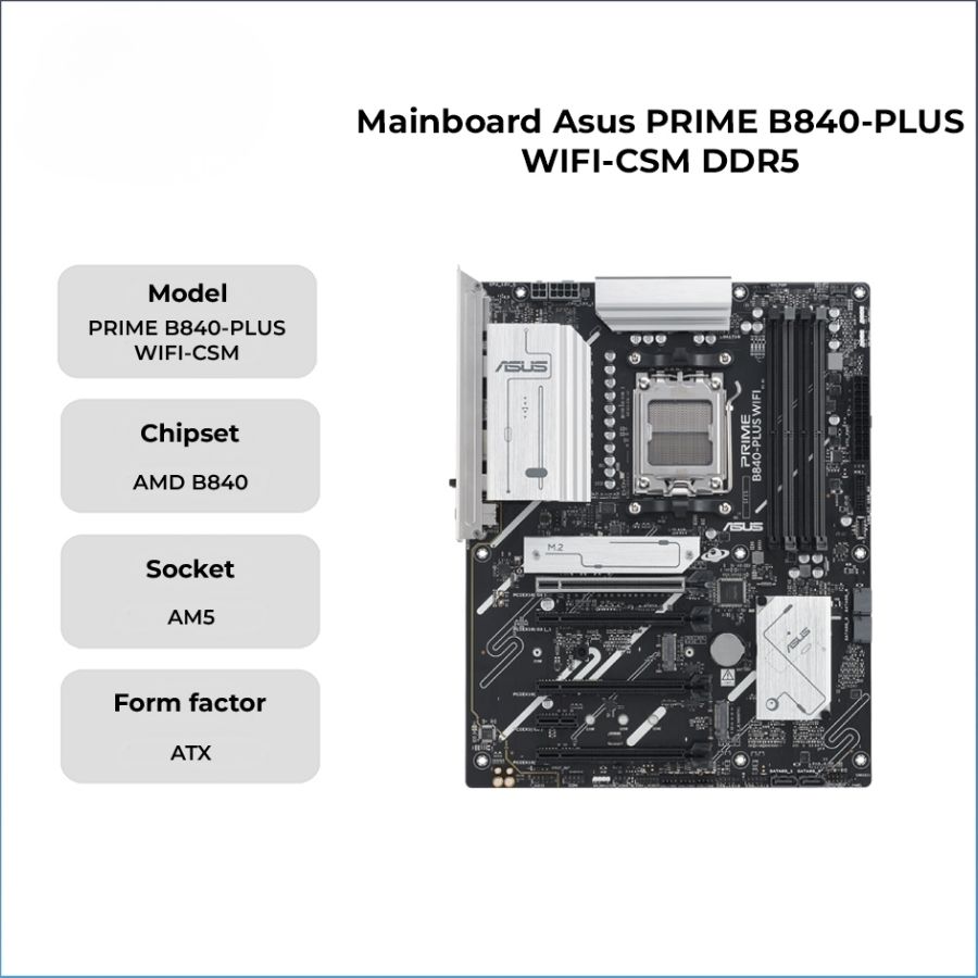 ASUS PRIME B840-PLUS WIFI-CSM là bo mạch chủ ATX thuộc dòng PRIME CSM của ASUS, hướng đến người dùng cần hiệu năng ổn định và tính năng cao cho hệ thống dựa trên nền tảng AMD Socket AM5. Với hỗ trợ DDR5, WiFi 6E tích hợp, mạng 2.5Gbps, khe mở rộng tốc độ cao và nhiều công nghệ bảo vệ, sản phẩm này là lựa chọn phù hợp cho gaming, làm việc chuyên nghiệp và cả hệ thống AI / content creation.