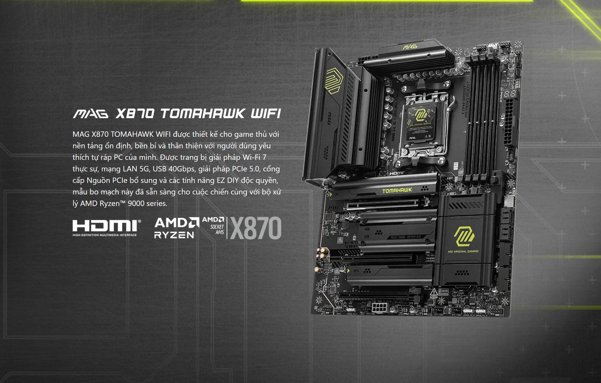 Trong thế hệ chipset mới của AMD — X870 & X870E — MSI đưa ra dòng MAG X870 TOMAHAWK WiFi như một lựa chọn “giữa” giữa hiệu năng cao và giá thành hợp lý. Với hỗ trợ cho CPU AM5 mới nhất, RAM DDR5 tốc độ cao, kết nối USB4 / WiFi 7 và hệ thống VRM mạnh mẽ, chiếc bo mạch này được đánh giá là phù hợp cho game thủ, người sáng tạo nội dung hoặc người muốn build PC “tương lai” mà không cần đến các bo mạch cao cấp quá đắt đỏ.