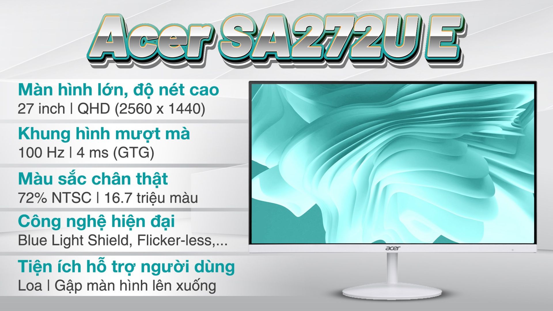 Acer SA272U E là màn hình 27 inch đẳng cấp thuộc dòng SA của Acer, nổi bật với ngoại hình trắng tinh tế, thích hợp những không gian làm việc hiện đại hay setup gaming mang phong cách nhẹ nhàng, sáng sủa. Máy sử dụng tấm nền IPS chất lượng cao, độ phân giải QHD (2560 × 1440), tần số quét 100 Hz và thời gian phản hồi 4 ms — một cấu hình cân bằng giữa hiệu năng và trải nghiệm hình ảnh đẹp mắt.