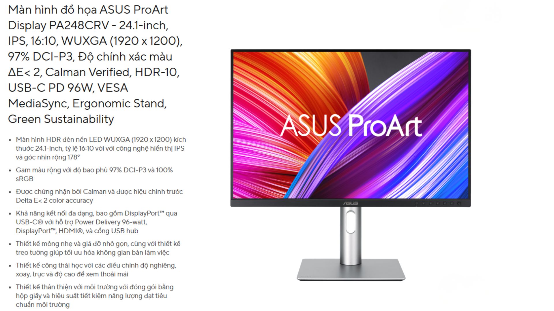ASUS ProArt PA248CRV là lựa chọn rất phù hợp cho người làm sáng tạo nội dung, lập trình viên, designer hoặc người dùng cần một màn hình ổn định, nhiều tính năng hỗ trợ, vừa làm việc vừa giải trí nhẹ. Với tấm nền IPS, cổng USB-C + loa tích hợp, chế độ bảo vệ mắt và khả năng điều chỉnh rộng, PA248CRV mang lại trải nghiệm đáng giá trong phân khúc màn hình chuyên nghiệp.